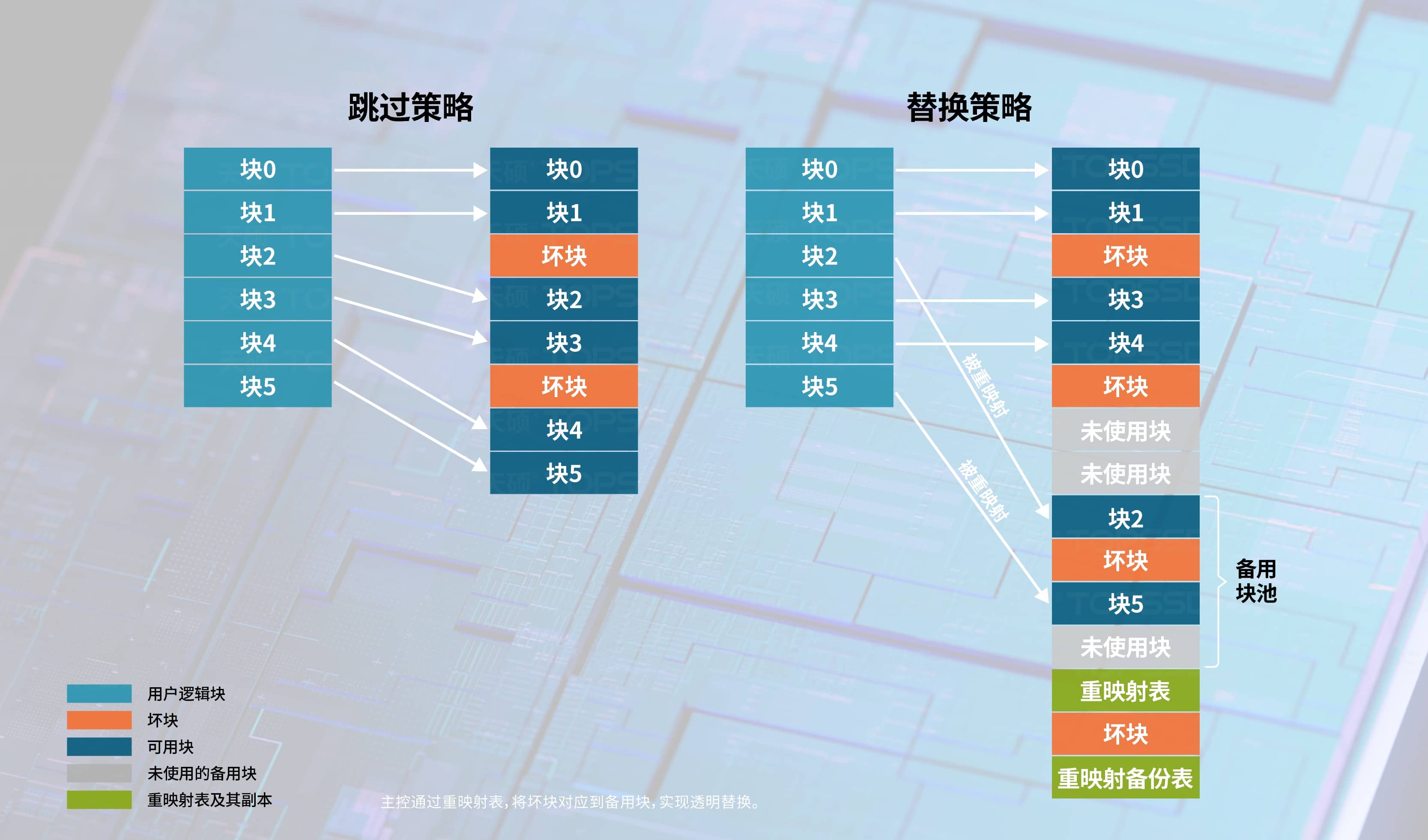 一旦某个块因错误过多超出ECC纠错能力,或写入验证失败,主控会立即将其标记为坏块,列入“坏块表”。